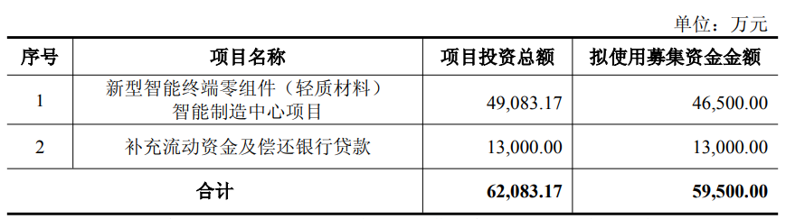 本次发行的可转债所募集资金总额不超过59,500万元(含本数),扣除发行费用后,用于新型智能终端零组件(轻质材料)智能制造中心项目、补充流动资金及偿还银行。